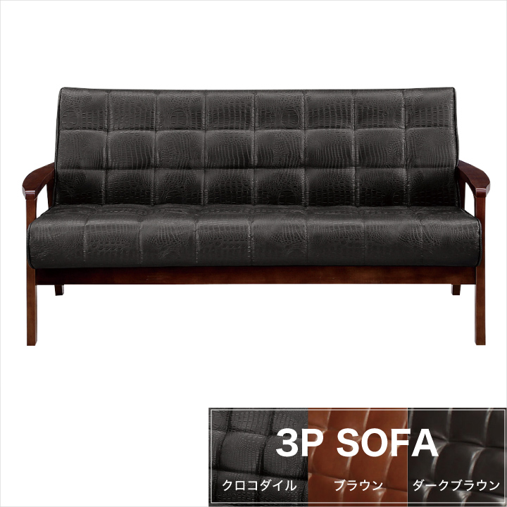 ソファ PVCソファ 3人掛け 3P レトロ ミッドセンチュリー ヴィンテージ ブルックリン おしゃれ カフェ ウッドフレーム / 木 バイキャストレザー クロコダイル ブラック ブラウン 送料無料 通販 ikr-0445