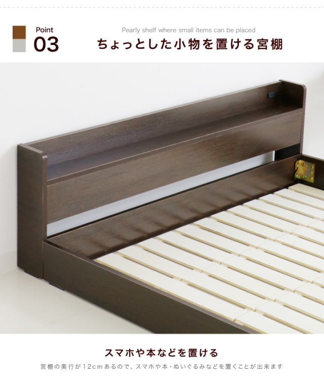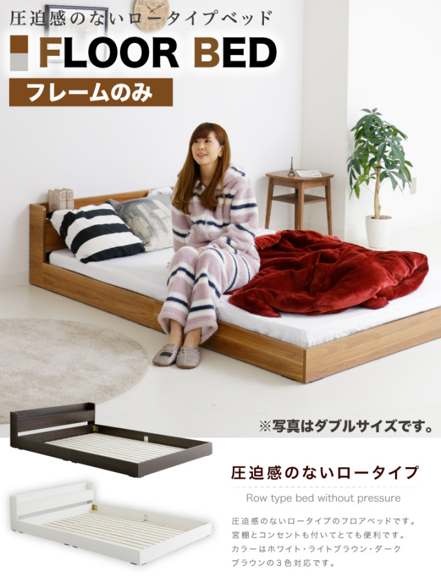 今話題のフロア仕様の木製ローベッドです 便利な宮棚とコンセントも付いて大変便利です。引っ越しの際は細かく分解できるので持ち運びも楽々です。