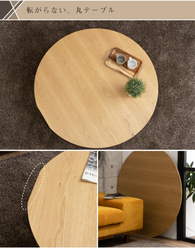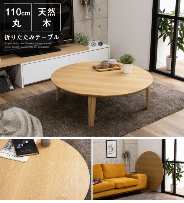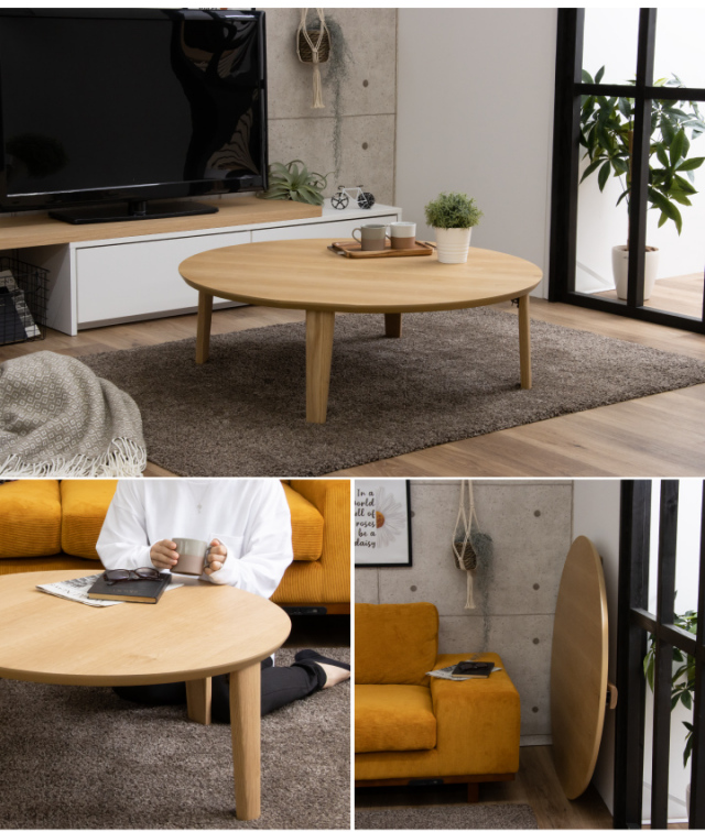 天然木オーク材を使用した折りたたみ式のローテーブルです。収納時に転がらないように側面に一部フラットにしています。| 材質 |
