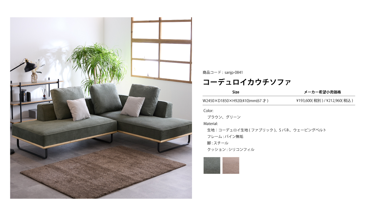 話題のコーデュロイ生地を使用し天然パイン無垢フレームとスチール脚がおしゃれなコーナーカウチソファです。
