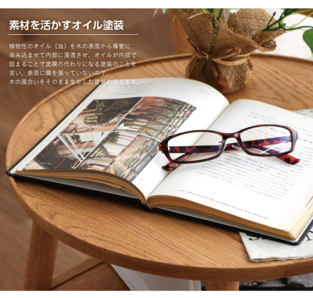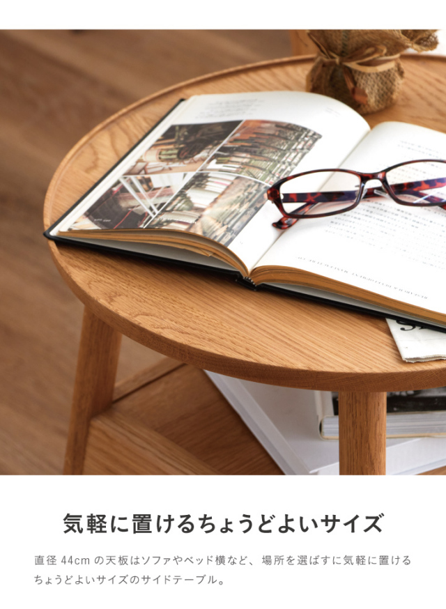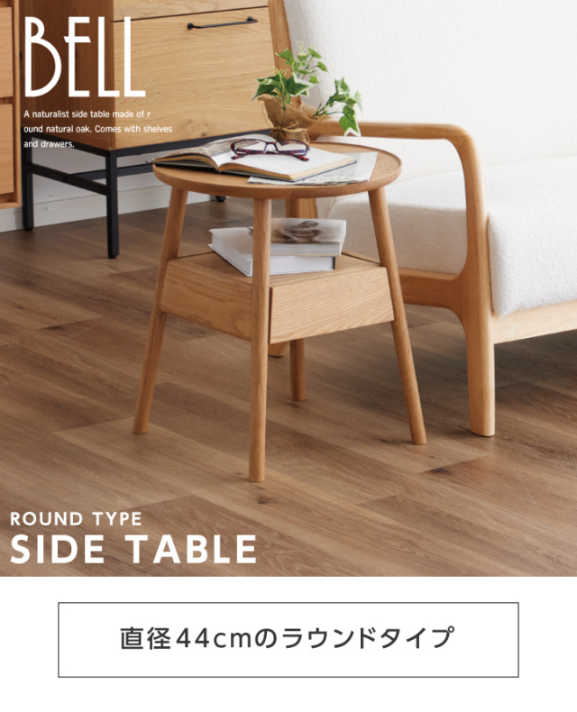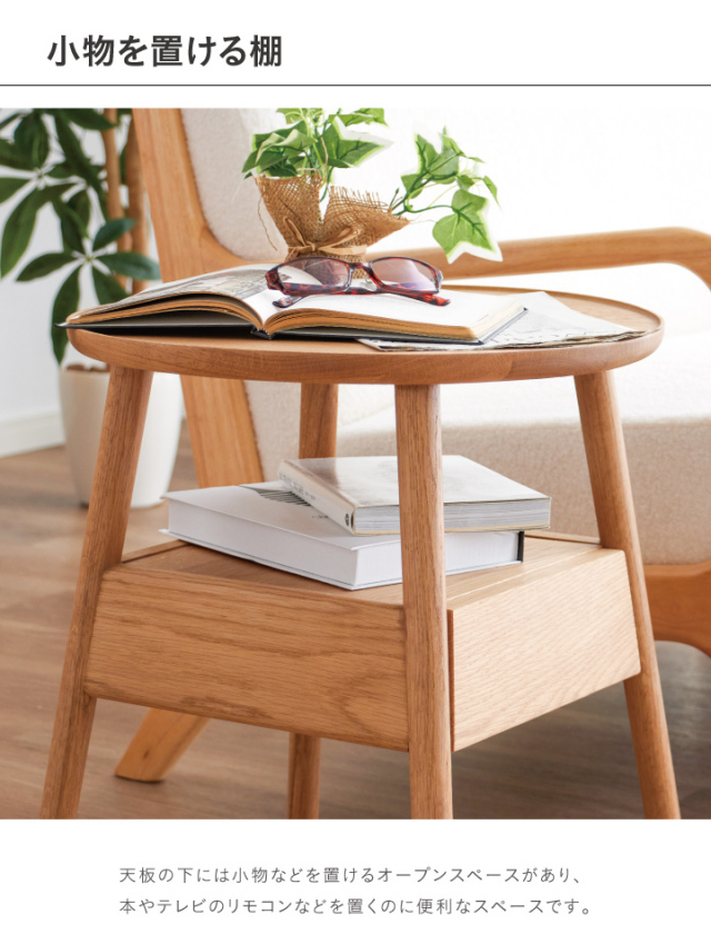 天然木無垢のフチあり天板がおしゃれでかわいい丸形サイドテーブル、引き出し付きです。| 材質 |