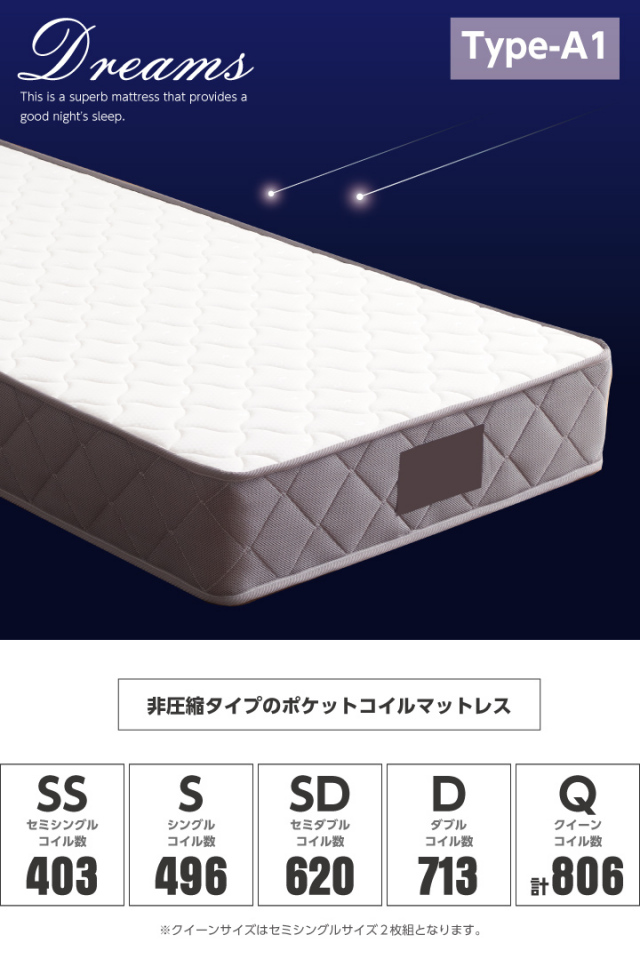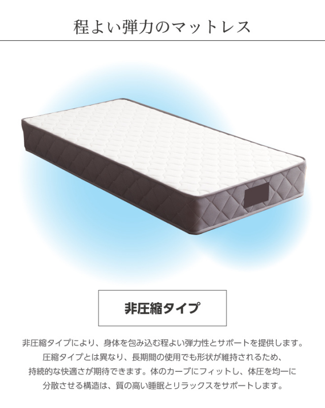 快適な寝心地を提供する非圧縮タイプのポケットコイルマットレスです。1.9mmのコイル径を持つポケットコイルが並列に配置され、さらに外側の2列は2.2mmのコイル径で構成されています。この設計により、硬めのサポートが得られ、寝返りを打ちやすく、同時に型崩れを軽減します。マットレスの表面生地には伸縮性に優れたニット素材が採用されており、快適な寝心地を演出します。また、側面には通気性を高めるためにメッシュ生地が使用されています。質の高い睡眠をサポートする、優れたマットレスとなっています。