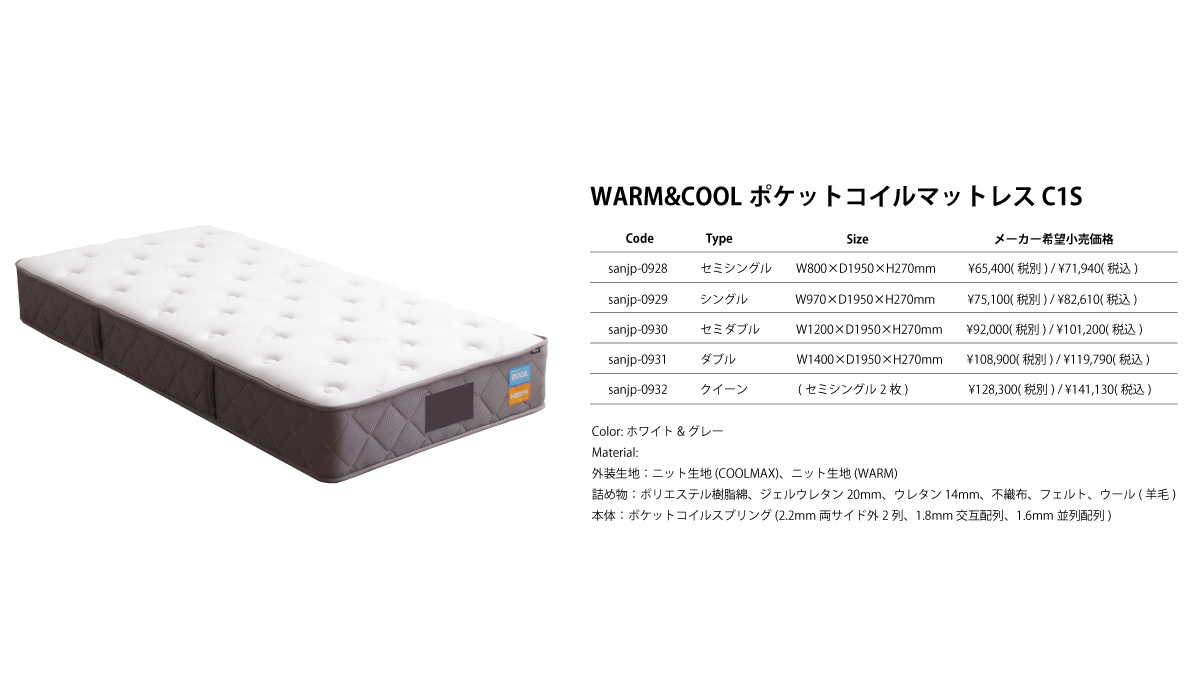 外装生地:ニット生地(COOLMAX)、ニット生地(WARM) 詰め物:ポリエステル樹脂綿、ジェルウレタン20mm、ウレタン14mm、不織布、フェルト、ウール(羊毛) 本体:ポケットコイルスプリング(2.2mm両サイド外2列、1.8mm交互配列、1.6mm並列配列) コイル数(756個) |