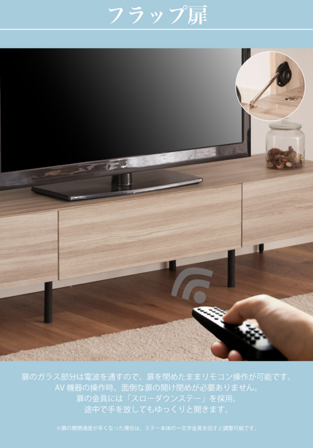 半完成品(脚はお客様取り付け) スローダウンステー扉を採用しています。 引き出しフルオープンレール付き フラッペ扉部分はリモコンが通る前板構造 |