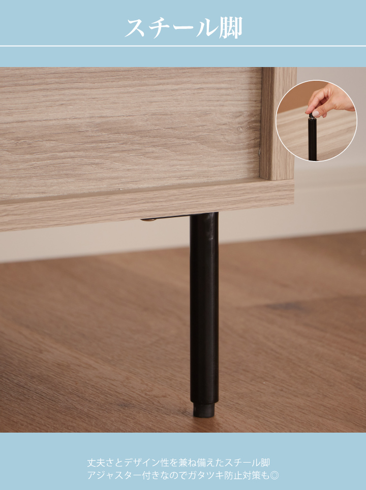 スチール脚はアジャスター付きなのでガタツキ防止対策も◎| 材質 |