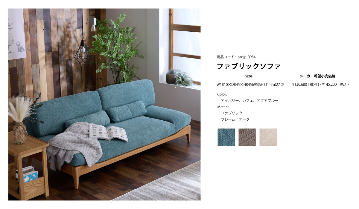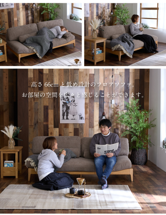 天然木オークのフレームを使用したおしゃれでモダンなロータイプファブリックソファです。