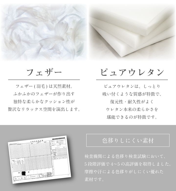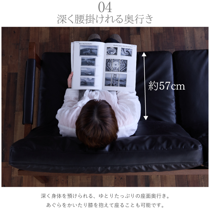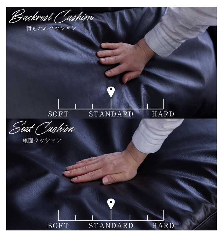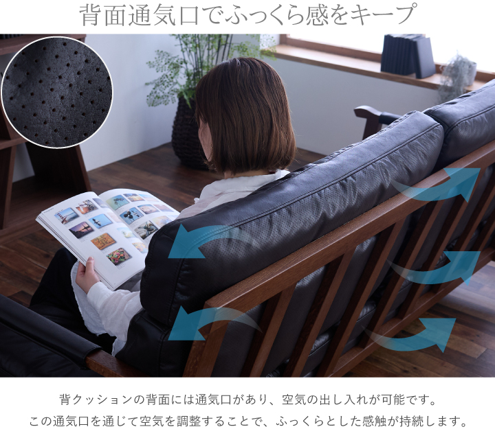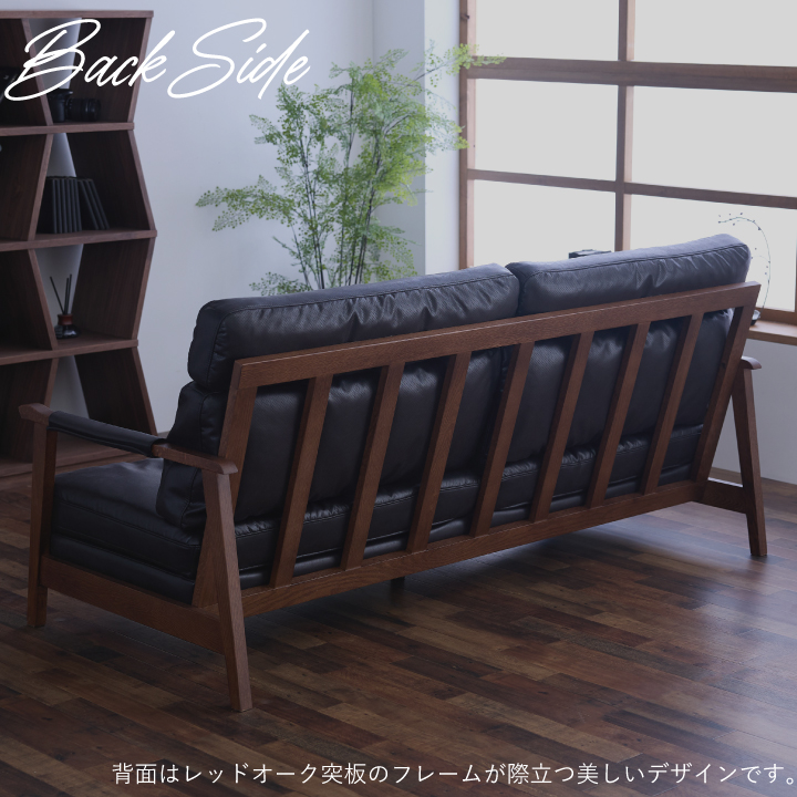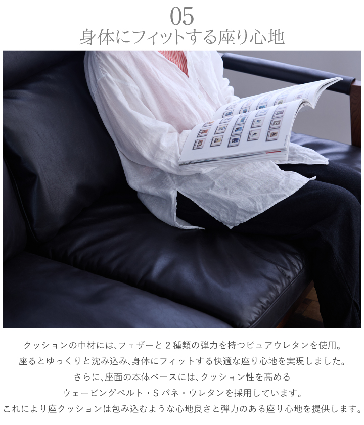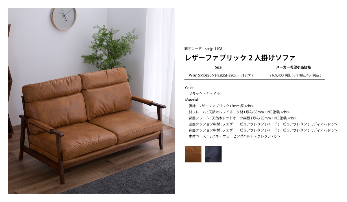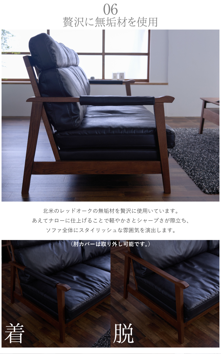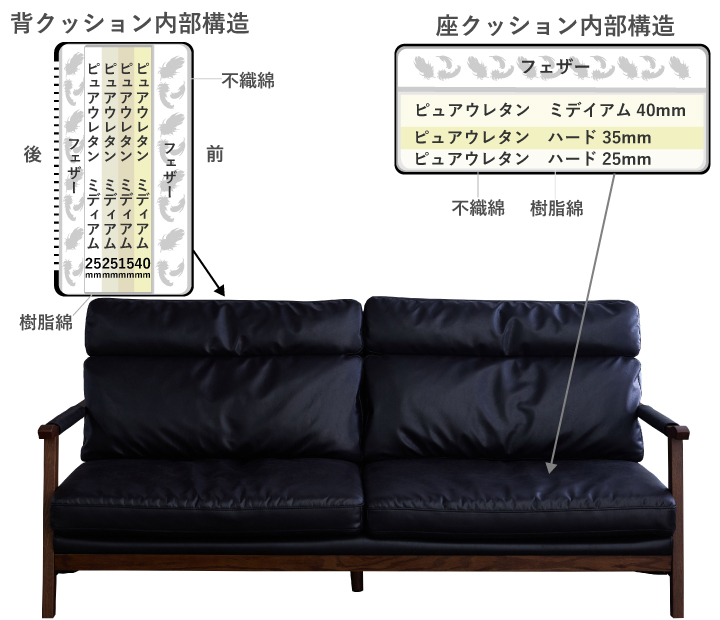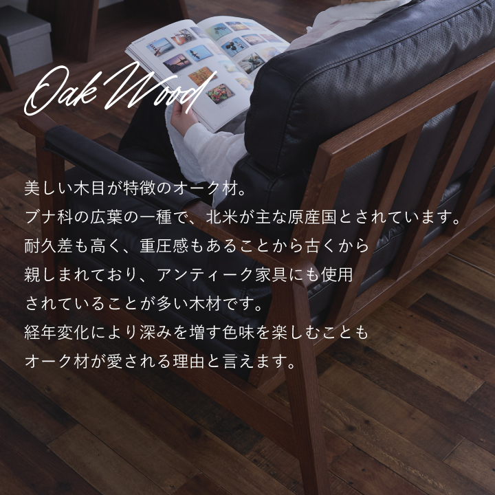・張地:レザーファブリック(2mm厚) ・肘フレーム:天然木レッドオーク材(厚み38mm・NC塗装) ・背面フレーム:天然木レッドオーク突板(厚み28mm・NC塗装) ・座面クッション中材:フェザー・ピュアウレタン(ハード)・ピュアウレタン(ミディアム) ・背面クッション中材:フェザー・ピュアウレタン(ハード)・ピュアウレタン(ミディアム) ・本体ベース:Sバネ・ウェービングベルト・ウレタン |
