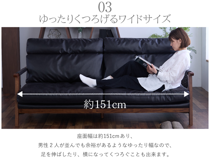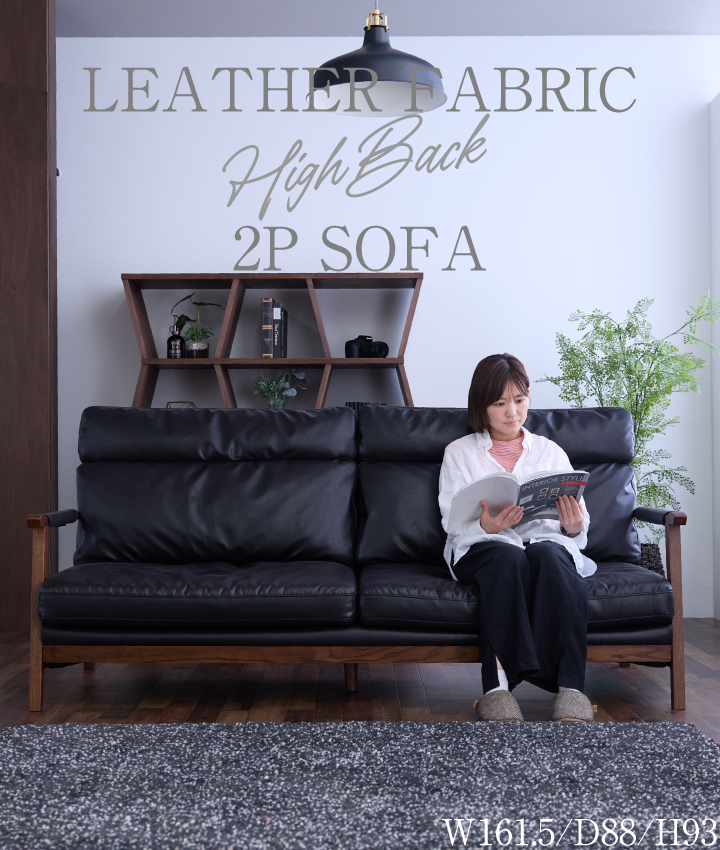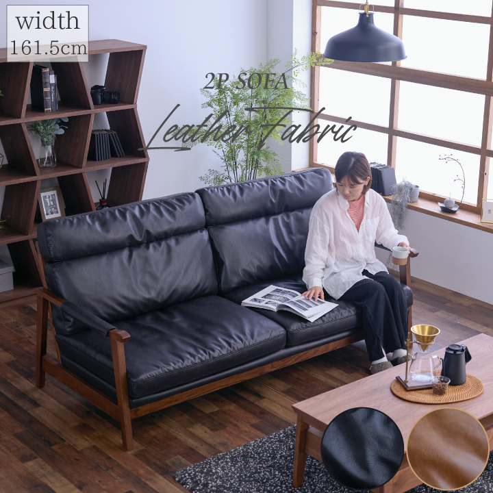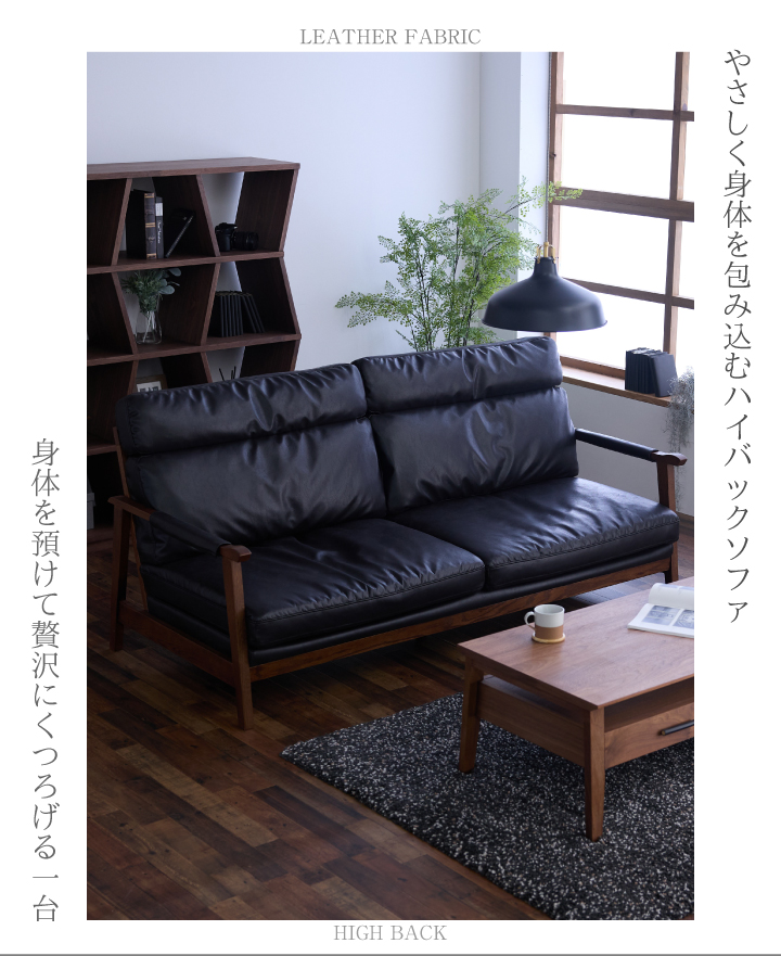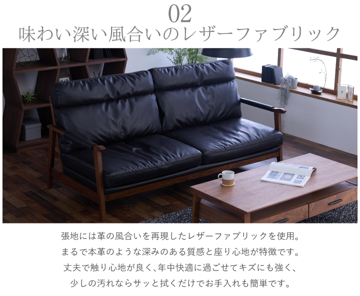 キズ・引っ張りに強いレザーファブリックと木製のフレームが北欧を感じさせるオシャレなソファです。アーム部分にはカバーが付いています。