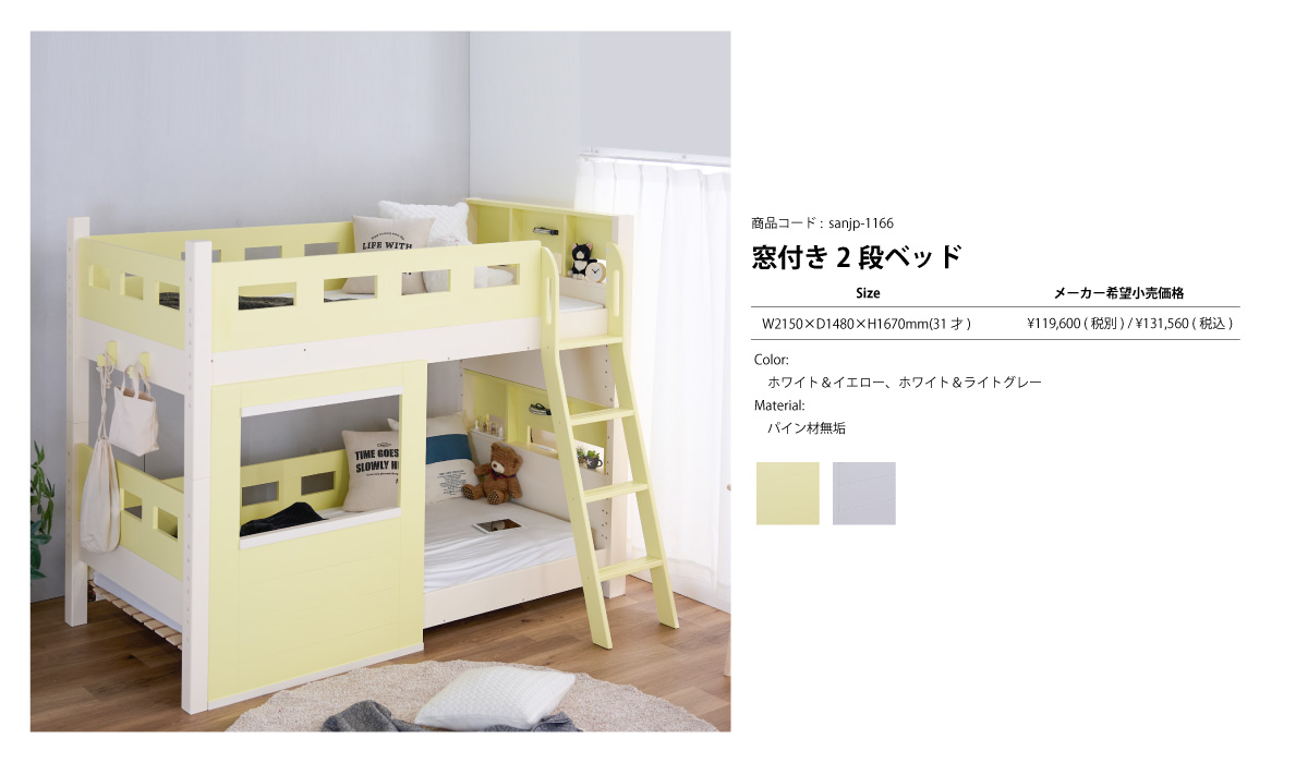 可愛い窓付き2段ベッドで、安心&便利!耐震仕様のスチール芯棒で安心設計。下段は3段階で高さ調節が可能で、ベッド下に収納スペースも確保できます。宮棚には照明と2口コンセント付きで、使い勝手も抜群。分離してシングルベッドとしても使える、長く愛用できるベッドです。