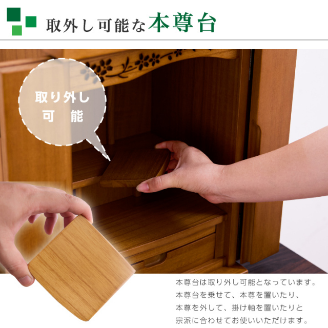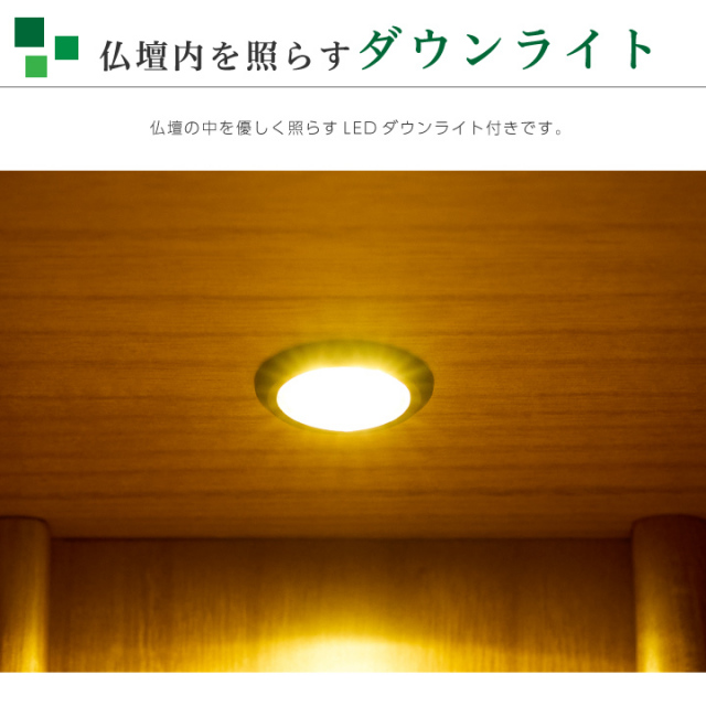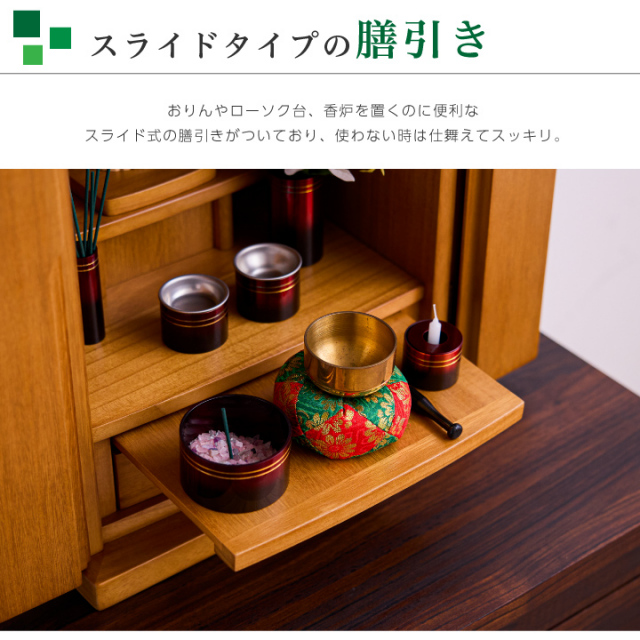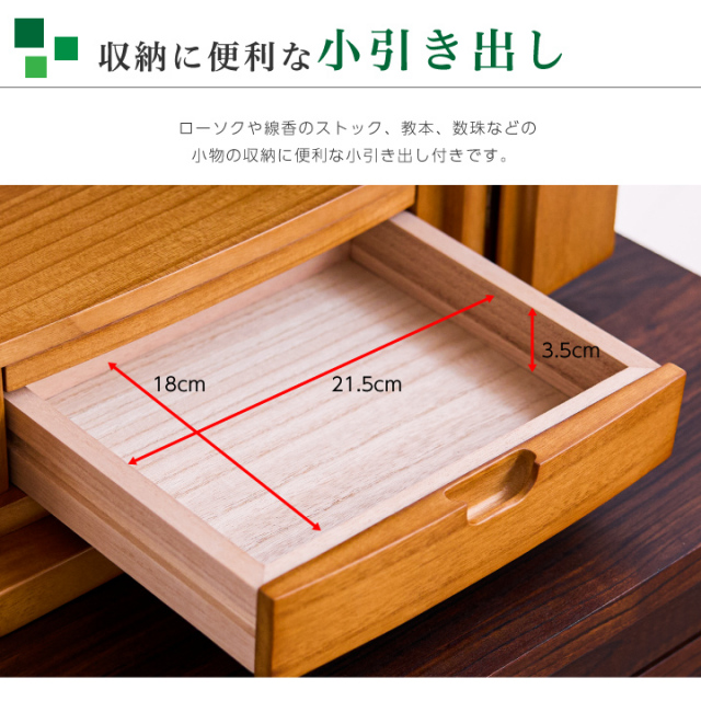 ・完成品 ・輸入品 ・本尊台付き ・膳引き付き(ストッパーなし) ・引き出し付き ・LEDダウンライト付き |
