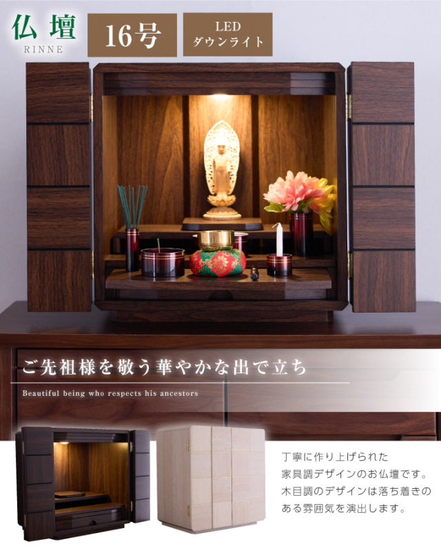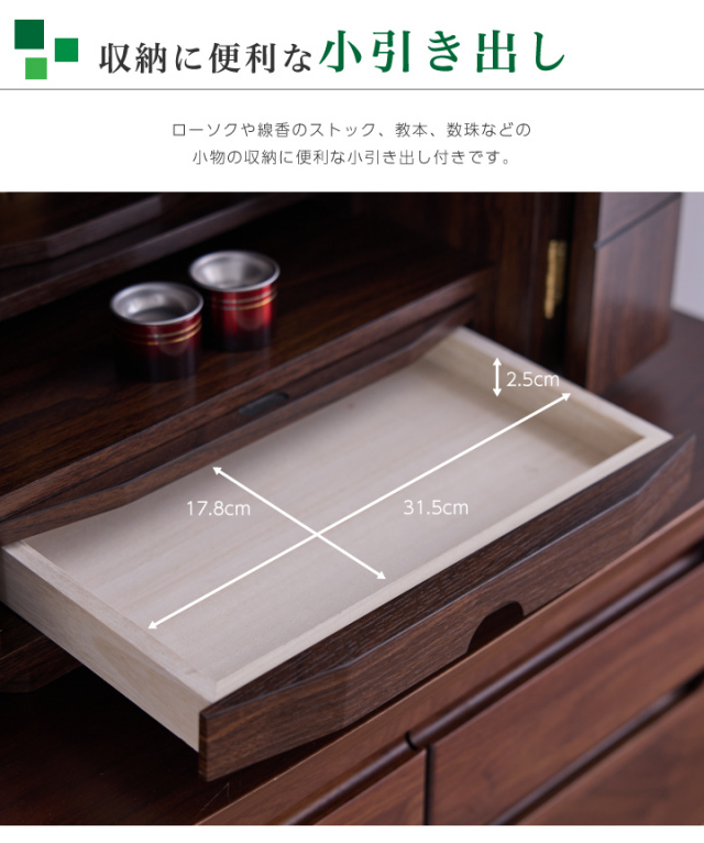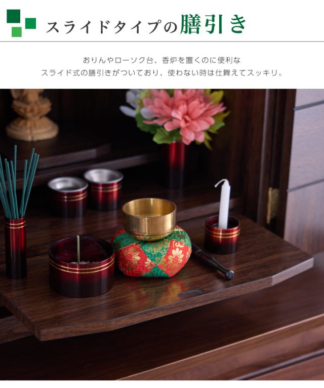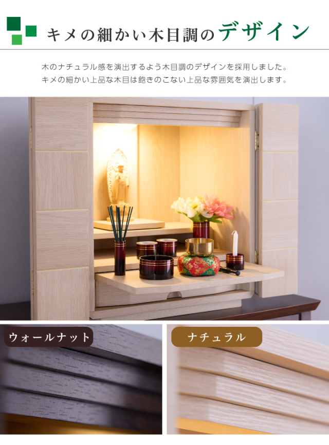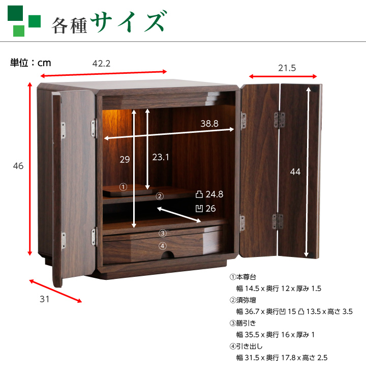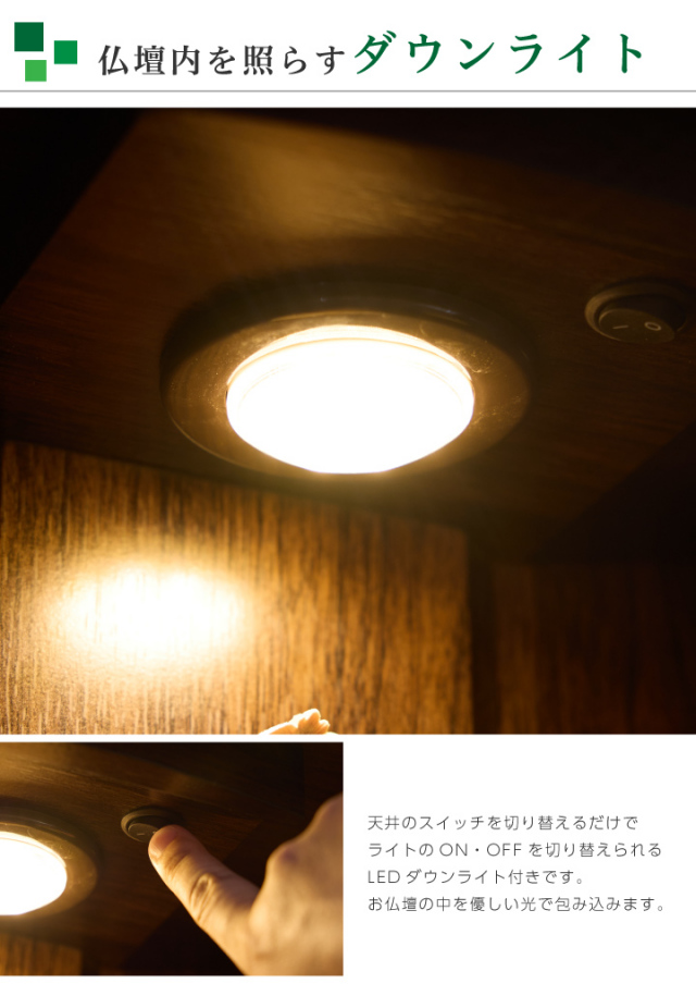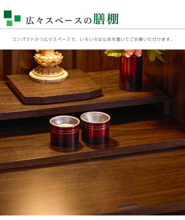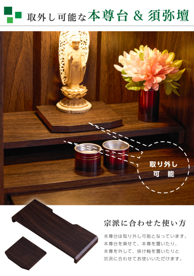 ・完成品 ・輸入品 ・本尊台付き ・取り外し式須弥壇 ・膳引き付き ・引き出し付き ・LEDダウンライト付き |